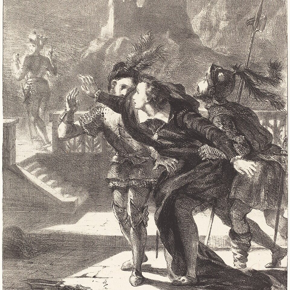 Eugène Delacroix — Hamlet Wishes to Follow the Ghost of His Father (1835)